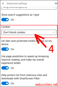 Microsoft Edge: Menu≡/Advanced Settings/Cookies